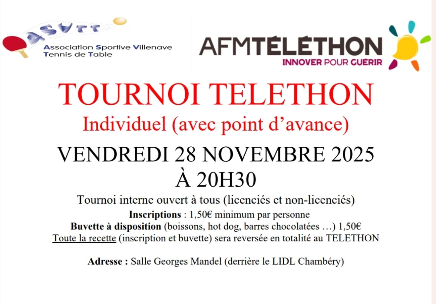 Les bénéfices de la soirée seront reversés au téléthon avec une inscription à 1,50€ minimum, mais vous pouvez donner ce que vous souhaitez ![]()